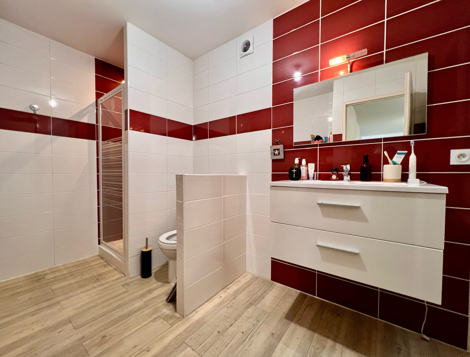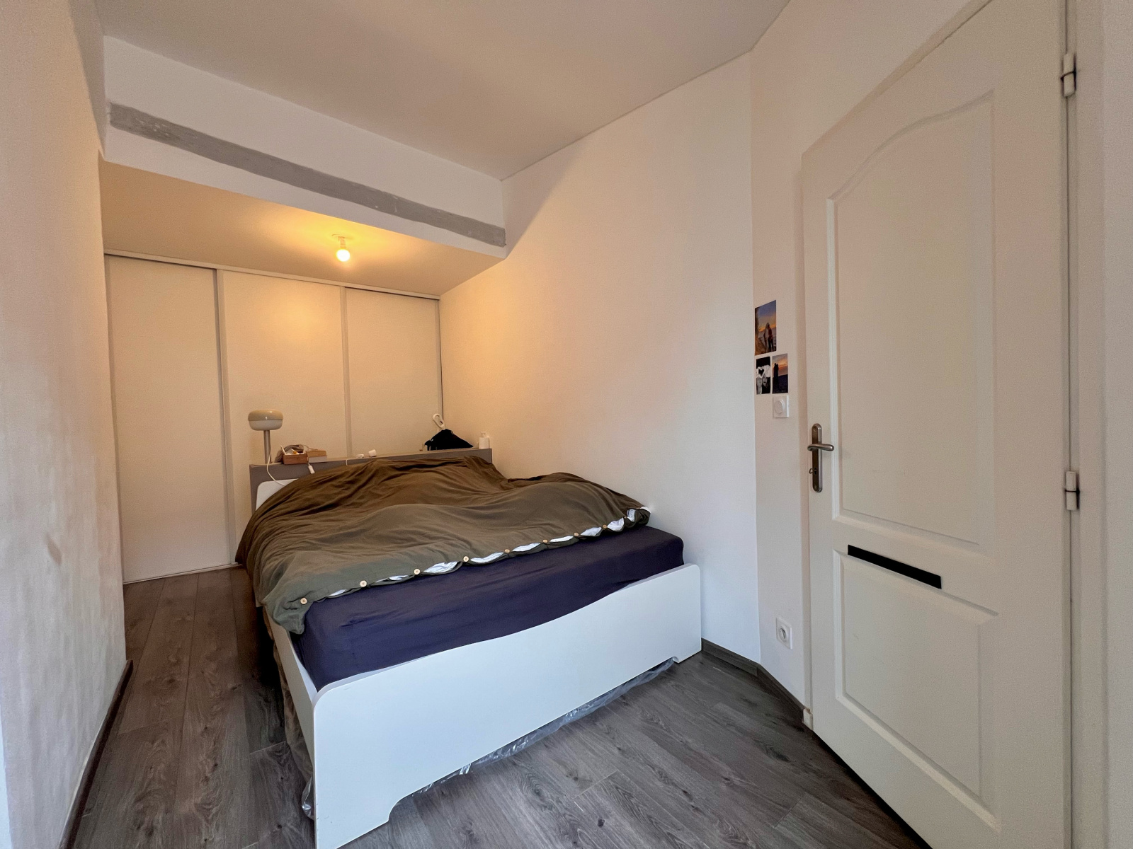 La chambre, spacieuse, dispose de placards intégrés. Une salle d’eau complète l’ensemble.