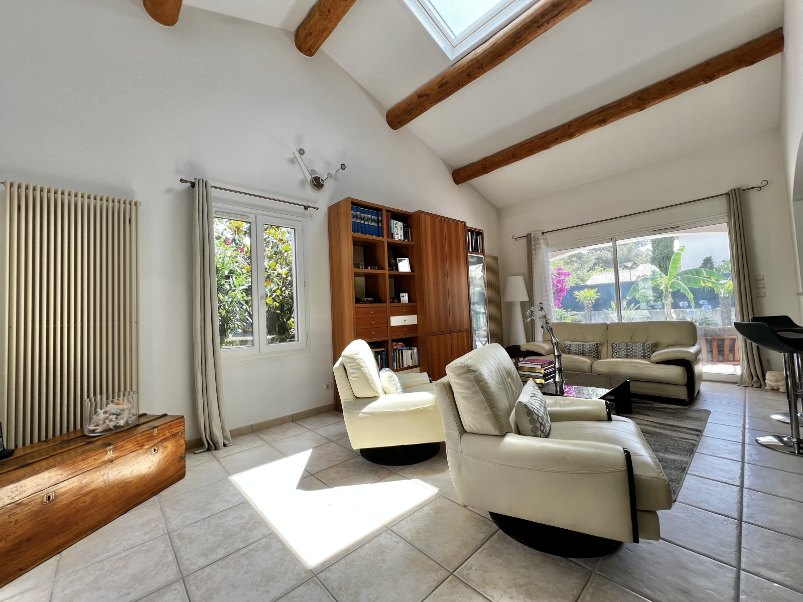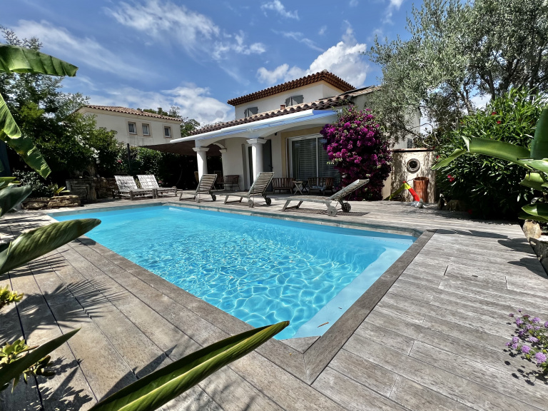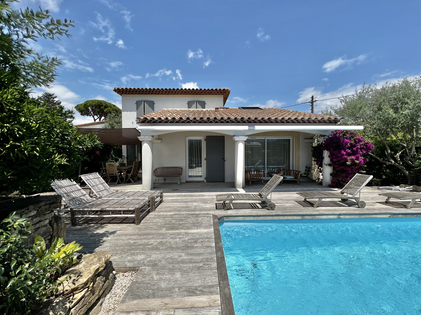 CE BIEN A ETE VENDU Une situation agréable dans le secteur calme et privilégié de Sainte-Marguerite, recherché pour son côté pavillonnaire, familial et très plaisant à vivre. Édifiée sur un terrain plat et arboré, cette jolie maison d’architecte à été bâtie de façon traditionnelle en 2007. Parfaitement entretenue par ses propriétaires, elle dispose d'une superficie habitable de 105m2 et bénéficie de nombreuses prestations de qualité. Son niveau de plain-pied est composé d'une belle entrée, une grande pièce à vivre de 45m2 répartie entre une cuisine entièrement équipée, un coin dinatoire et le séjour - une chambre parentale avec dressing et salle de bains, un WC avec lave-mains. À l'étage, deux chambres dont une ayant accès à un solarium - une salle de bains et un WC. L'ensemble des pièces donne sur le jardin et bénéficie d'une exposition plein sud, sans aucun vis à vis. Entièrement clôturé, le jardin de 437m2 à été joliment paysagé par de nombreuses espèces méditerranéennes et des murets en pierres sèches, permettant ainsi un entretien facile. L’espace piscine bénéficie d’une magnifique terrasse en teck, à l’abri des regards. Ce bien clés en mains dispose également d’un grand garage. Vous apprécierez l’usage pratique de cette maison et les nombreuses choses qu’on peut y faire à pieds, les commerces, les écoles, le parc fraîchement rénové de Sainte marguerite ou encore les plus jolies criques se trouvent à quelques minutes de marche. Un bien rare dans ce secteur si convoité.